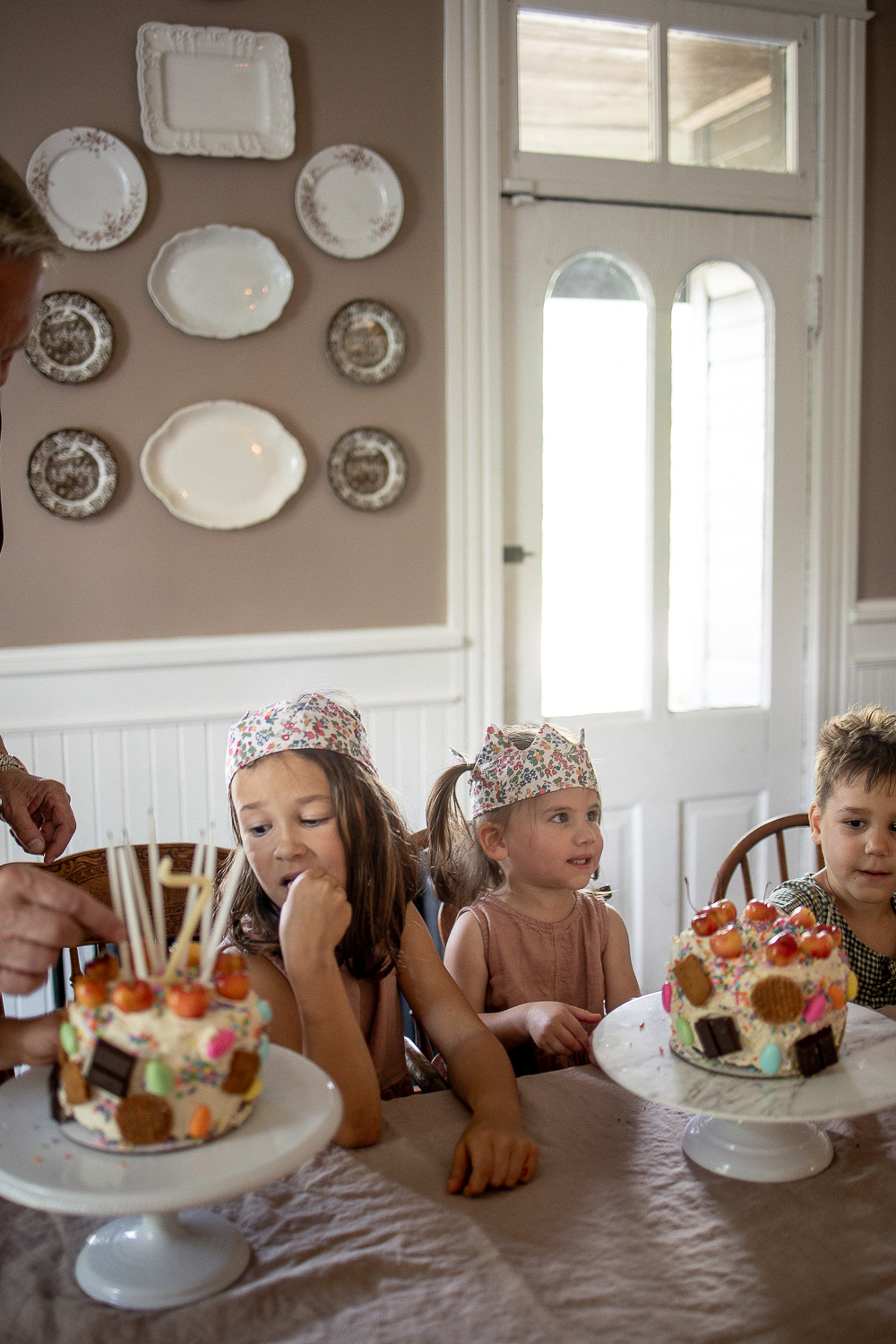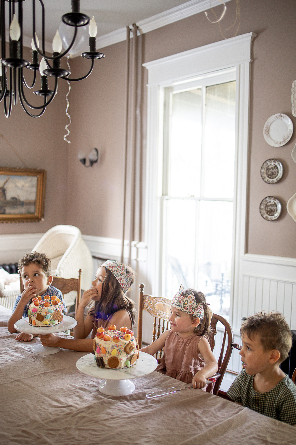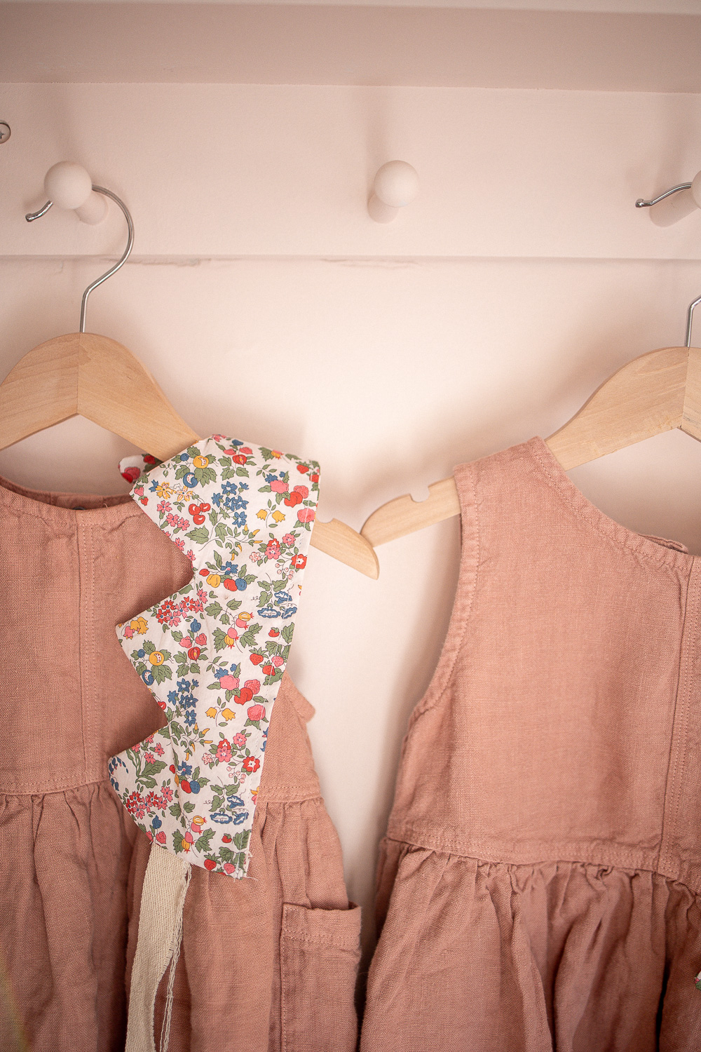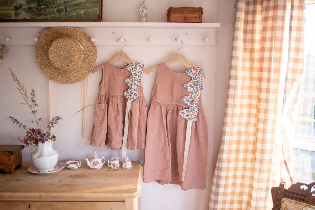 New this year were some birthday crowns I decided to sew. This Liberty of London print my mom brought back from the UK. I am saving as much as I can for it, I think I have just enough for a dress for Penny. I’d love to at one point embroider the girls’ names and year along the ties. These crowns are so easy to make. I do think next time I’ll swap batting for interfacing, or try another (thicker) interfacing. Langston and Theodore have already requested their crowns. I am finding that I am truly enjoying and appreciating sewing these days. Matching sister dresses in flowing pink linen are from Mama Owl.