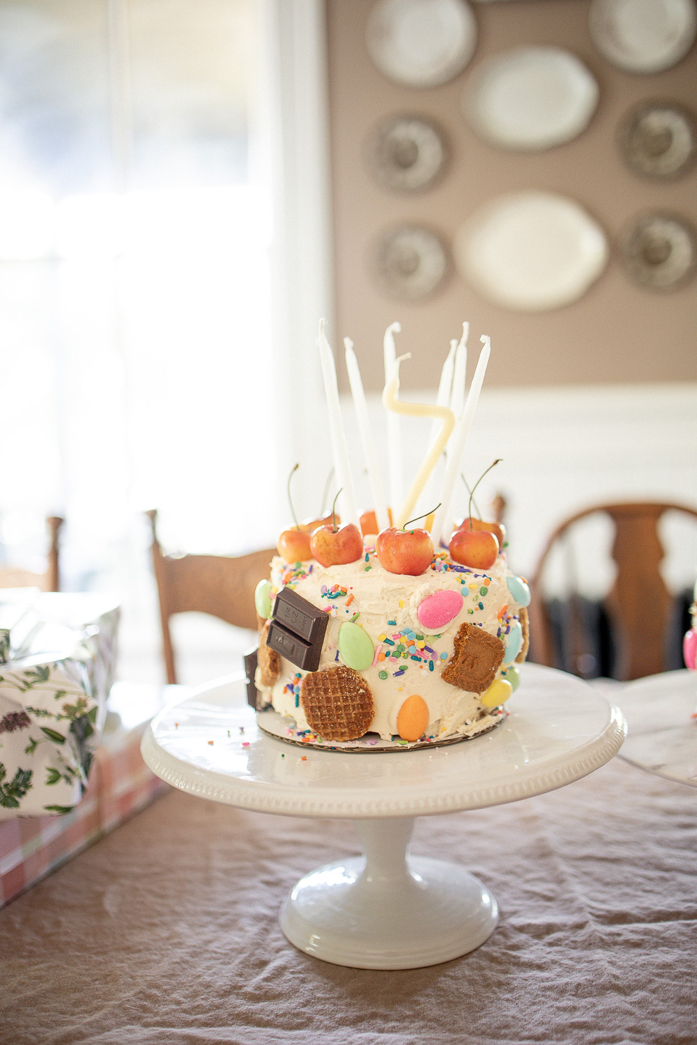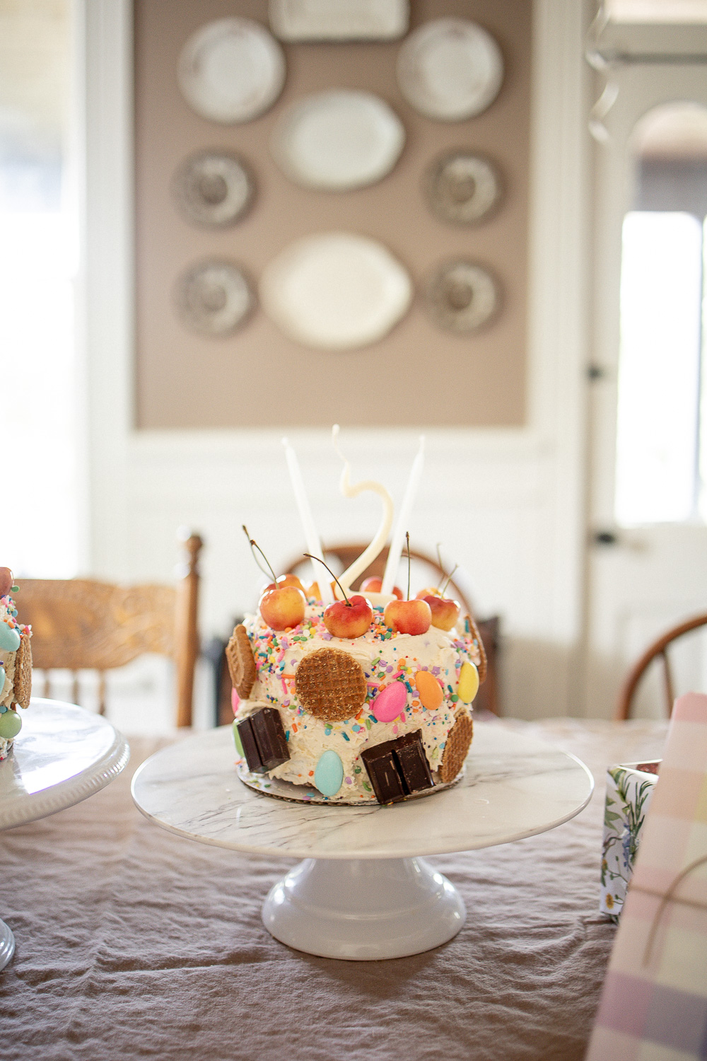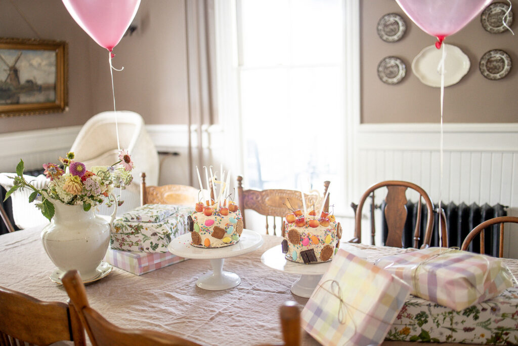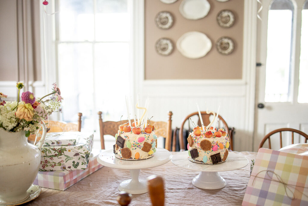 A few weeks ago while planning our celebration, I stumbled upon a whimsical cake covered in candies and cookies. I thought to myself, I bet Priscilla would love that and it would be easy to make. I baked up two mini, double layer funfetti cakes and frosted with vanilla buttercream. Decorating it was fun, and the girls seem happy with them and that’s all that matters. I usually bake my cake a few days ahead of time, freeze it, then take it out and do a crumb layer of frosting the day before, and then on our party day take it out and finish frosting and decorating. A baking friend taught me this trick and it has made homemade cakes that much easier. The only hard part is remembering to begin baking three to four days in advance.