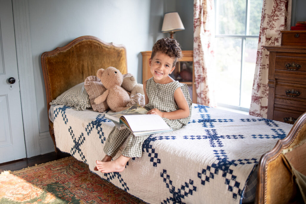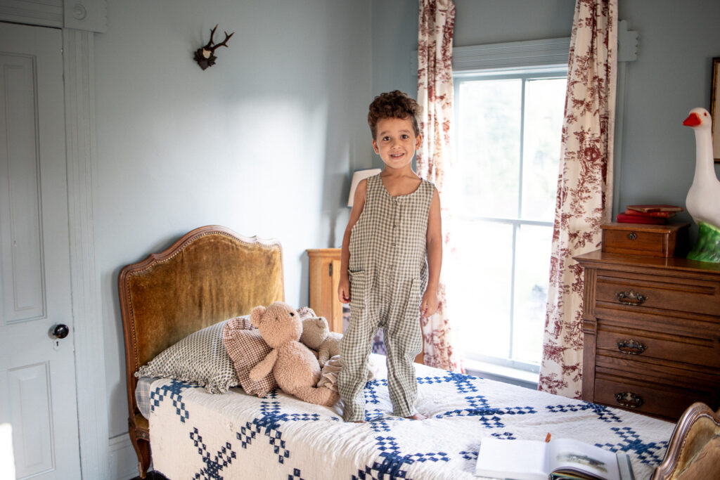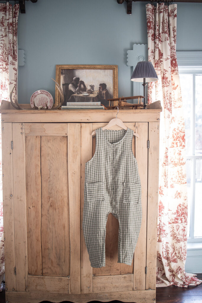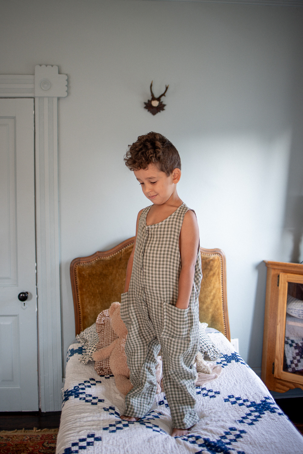 This has been the summer of sewing for me, and I am sort of surprised by how this newfound hobby of making clothing for my children really brings joy. After sewing for the girls I started working on a jumpsuit for the boys, starting with one for Langston out of this delicious green gingham linen from iseefabric. This was a very challenging pattern for me, after feeling like the two gowns I made the girls were pretty easy. I found the pattern from Red Creek Kids, who also seems to periodically sell these rompers. I went into this project with pride, which is typically a recipe for disaster. I plan on making one for Teddy, but will be adjusting the pattern a bit to make it more beginner friendly. I really struggled with the bias tape around the neckline and ended up skipping it for the armholes. By the time I was close to done it was looking pretty rough to me.